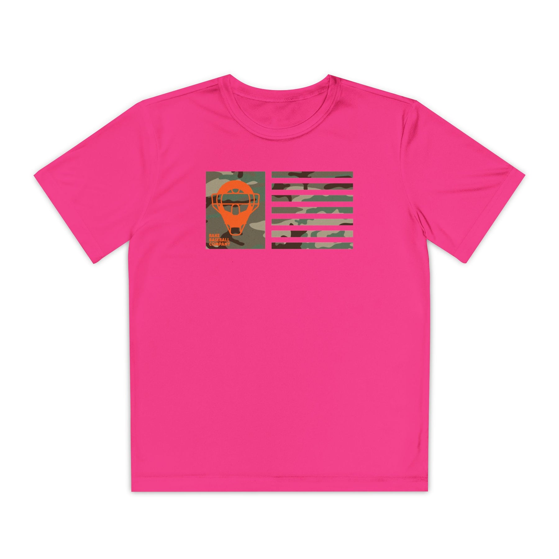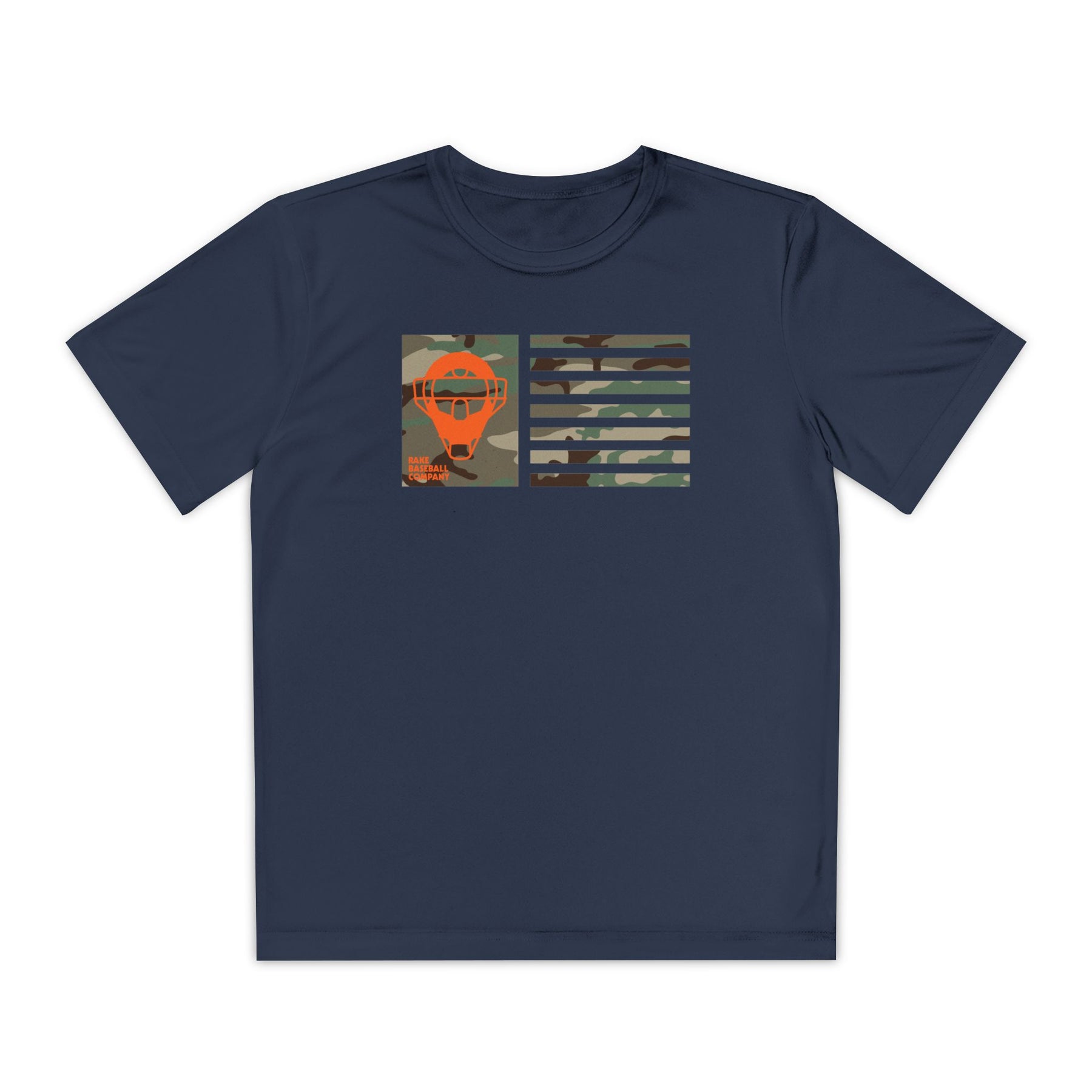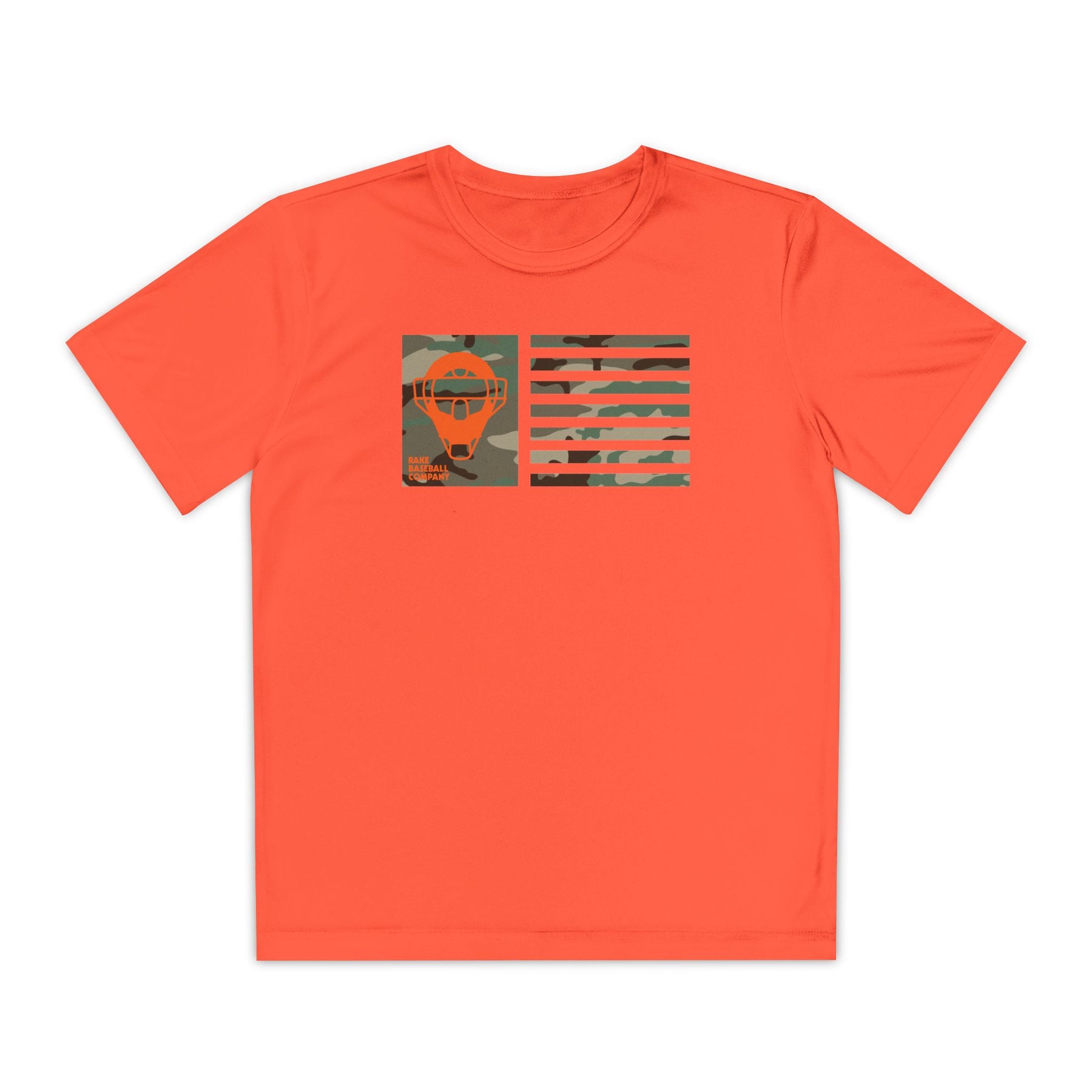 Kids Catcher's Orange Camo Mask Flag Dry Fit Tee - Rake Baseball Company - RAKE BASEBALL | BASEBALL T-SHIRT | BASEBALL CLOTHING | GOOD VIBES ONLY